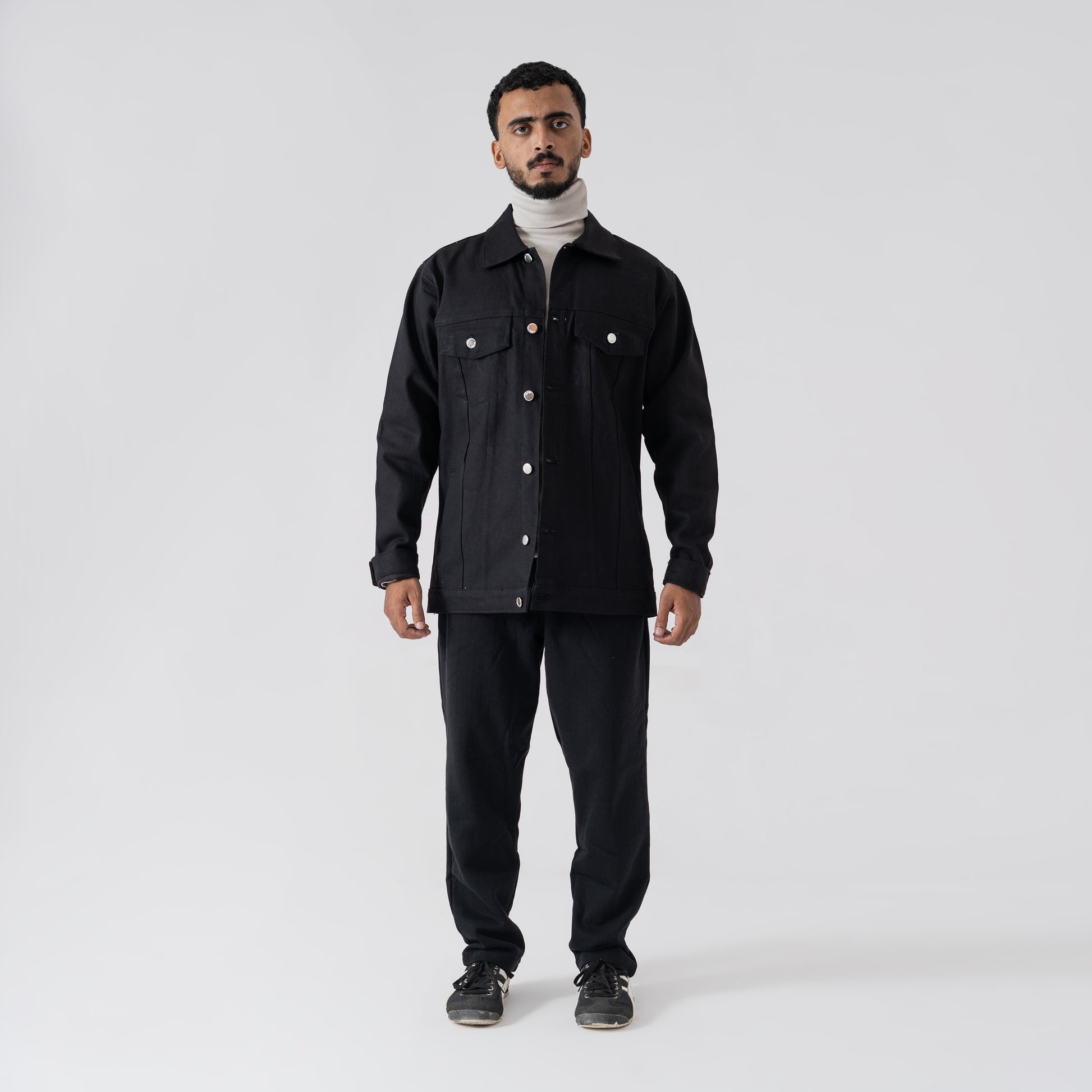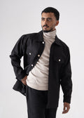 The 'Shadow' Black Overshirt is the ideal piece for stylish, comfortable layering. Made from a heavy black twill or structured cotton fabric, it offers the perfect balance between a shirt and a light jacket (a 'shacket'). It features a classic pointed collar, a full metal button closure, and two flap chest pockets. The relaxed, boxy fit makes it easy to layer over knitwear or hoodies, adding an element of effortless cool and structure to any casual ensemble.